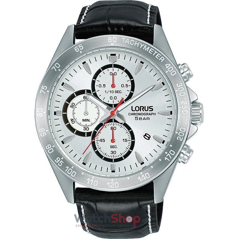 Stil: Casual SportColectia: SportTip: BarbatescDisplay: AnalogMecanism: QuartzProvenienta mecanism: JaponezRezistenta la apa: 5 ATMIndica: Ora, minute, secunde, Data, Cronograf, TahometruCuloare cadran: ArgintiuMaterial geam: Cristal mineral durificatTip citire cadran: LiniiForma carcasei: RotundaMaterial carcasa: Otel inoxidabilCuloare carcasa: ArgintiuDimensiune carcasa: 43 mmGrosime carcasa: 11 mmMaterial curea/bratara: PieleCuloare curea/bratara: NegruCuloare interior curea/bratara: NegruLatime curea/bratara (telescop): 22 mmCircumferinta curea/bratara: 22 cmSistem inchidere: Catarama standardFinisaj curea/bratara: Mata, Cusatura decorativa de culoare albaDesign curea/bratara: StantataCronograf: DaData: DaTahimetru: DaAlte detalii: Logo pe cadran, capac spate, Culoare markeri ora: Argintiu, Negru, Culoare aratatoare: Argintiu, Markeri si aratatoare cu insertii luminescente, Caseta data in dreptul orei 4, Cronograf pana la 60 de minuteGreutate: 80 grame