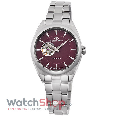 Stil: ClasicColectia: ContemporaryTip: DamaDisplay: AnalogMecanism: AutomaticDenumire mecanism: 55C22Provenienta mecanism: JaponezRezistenta la apa: 5 ATMIndica: Ora, minuteCuloare cadran: BurgundMaterial geam: Cristal safir antireflexTip citire cadran: Linii, 1 DiamantForma carcasei: RotundaMaterial carcasa: Otel inoxidabilCuloare carcasa: ArgintiuDimensiune carcasa: 30 mmGrosime carcasa: 10.5 mmMaterial curea/bratara: Otel inoxidabilCuloare curea/bratara: ArgintiuLatime curea/bratara (telescop): 14 mmSistem inchidere: Catarama tip fluture cu butoane lateraleFinisaj curea/bratara: LucioasaDesign curea/bratara: NetedaAlte detalii: Logo pe cadran, mecanism, coroana si catarama, Culoare markeri ora: Argintiu, Culoare aratatoare: Argintiu, Cadran semi transparent ce permite vizualizarea unei parti a mecanismului, Capac spate infiletat, ce permite vizualizarea mecanismului, Rezerva de functionare 40 ore, Mecanism cu 20 rubine