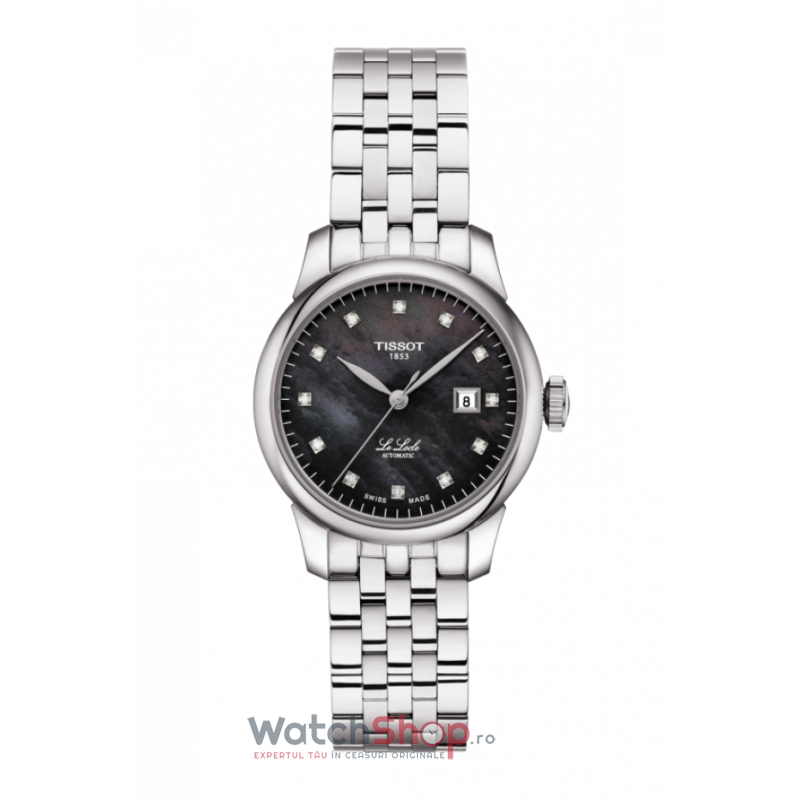Stil: CasualColectia: T-ClassicTip: DamaDisplay: AnalogMecanism: AutomaticDenumire mecanism: ETA 2671Provenienta mecanism: ElvetianRezistenta la apa: 3 ATMIndica: Ora, Minute, Secunde, DataCapac care permite gravura personalizata: NuCuloare cadran: MOP NegruMaterial geam: Cristal safirTip citire cadran: Linii, Cifre arabe si Cifre romaneForma carcasei: RotundaMaterial carcasa: Otel inoxidabilCuloare carcasa: ArgintiuDimensiune carcasa: 29 mmGrosime carcasa: 8.95 mmMaterial curea/bratara: Otel inoxidabilCuloare curea/bratara: ArgintiuCuloare interior curea/bratara: ArgintiuLatime curea/bratara (telescop): 14 mmSistem inchidere: Catarama tip fluture cu butoane lateraleFinisaj curea/bratara: LucioasaDesign curea/bratara: NetedaData: DaAlte detalii: Logo pe cadran, catarama, capac spate, Culoare markeri ora: Argintiu, Culoare aratatoare: Argintiu, Caseta data prezenta in dreptul orei 3, Capac spate transparent ce permite vizualizarea mecanismului, Mecanism automatic cu 25 de rubine, Autonomie de pana la 38 de ore dupa o incarcare completa, Design markeri ora: 12 diamante, Culoare diamante: Top Wesselton, Claritate diamante: vs-si, Taieri diamante: 8/8 o singura taiere, Carat diamante: 0.0456Greutate: 77 grame